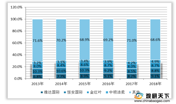 根据数据显示,2018年四家头部纸巾企业销售额市占率为31.4%,其中维达国际、恒安国际、金红叶以及中顺洁柔市占率分别为9.1%、8.8%、8.7%与4.9%。