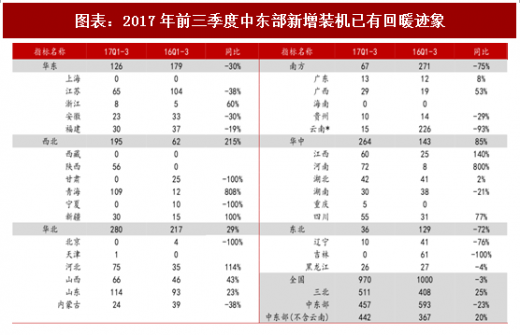 2018 年是风电建设区域转移第三年,中东部装机将理顺,释放节奏或趋于常态化。从2016年风电新增装机向中东部转移算起,2018年是区域转移的第三年,风电行业在这个过程中进行了很多努力来应对区域转移带来的周期拉长问题,比如减少施工机器和人员在每个机位点的等待时间、通过预装式升压站将设计+交付时间由9个月降低6个月等。通过这些努力,2017 年前三季度中东部装机已有回暖迹象,2017 年 1-9 月份全国风电新增装机970万千瓦,同比降低3%,其中中东部新增装机457万千瓦,同比降低23%,但如果扣除异常省份云南之后,中东部新增装机442万千瓦,同比增长20%,出现回暖迹象。因此,我们预计进入 2018 年以后,随着业主对中东部风电项目更加熟悉,中东部风电装机将理顺,释放节奏或趋于常态化。