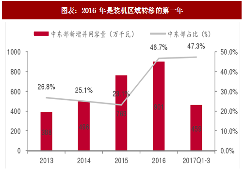 2016 年是风电新增装机大规模向中东部转移的第一年。由于三北弃风率较高以及风电投资红色预警,从 2016 年开始,风电新增装机向中东部转移,建设周期拖长,行业处于低迷状态。