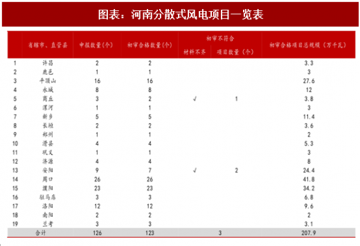 河南公示 2GW 分散式风电开发方案,拉开国内分散式风电序幕。2017 年 11 月 8 日,按照国家能源局《关于加快推进分散式接入风电项目建设有关要求的通知》(国能发新能[2017]3 号),河南省发改委对各地上报项目进行初审,初步审查符合条件的有123个项目,总规模207.9万千瓦。此次河南公布的分散式风电开发方案是国内分散式风电的第一枪。