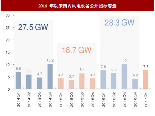 风电基本面好转。根据国家能源局公布的2017年上半年风电项目并网数据,2017年上半年,全国风电平均利用小时数同比增加7.3%,风电弃风电量235亿千瓦时,同比减少91亿千瓦时,弃风限电形势明显好转,风电基本面开始改善。风电设备的招标容量能够很好的反映风电设备的市场情况。2015年,风电招标容量为18.7GW,与2014年的27.5GW相比降幅较大。2016年,国内风电设备公开招标容量达到28.3GW,同比增长51.3%;2017年一季度,国内风电设备公开招标容量为7.7GW,为四年来同期最高水平。风电设备招标量的增加反映了风电设备装机需求将增加。