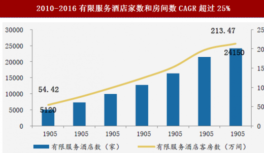 2010-2016有限服务酒店家数和房间数CAGR超过25%