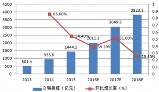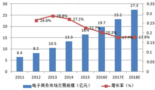 中国农业市场总体价值规模预计在10.15万亿人民币左右, 2015年,中国农业电子商务市场交易规模为1444.5亿元,渗透率不足1.5%,预测2017年开始将迎来高速增长期,环比增长率将达到51.6%,2018年,中国农业电子商务市场交易规模将超过3800亿元,未来中国农业电子商务市场发展空间巨大。