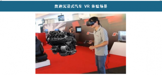 丰田新城“普锐斯 Prime”VR”营销。在 2016 年的 TechCrunch Disrupt 大会上,利用三星 Gear VR、HTC Vive 以及谷歌《Tilt Brush》让 VR 营销和体验变得充满趣味性。这次营销分三个环节,全部是虚拟现实,并没有任何靓丽的车模。参与丰田活动的观众在第一个环节中戴上三星 Gear VR 头显,观看一个宣传片。在第二个环节中,观众戴着 HTC Vive 在《Tilt Brush》中进行创作。在第三个环节中仍然戴着 HTC Vive 头显,观众将会体验丰田的《The Impossible Quest》VR 游戏,扮演一名逃窜的司机。有一名神秘的乘客拿着手提包走上了观众的车——丰田普锐斯Prime,要求用户最大油门驾驶。经过数分钟的竞速穿越到达目的地,给用户一种《侠盗飞车》的感觉。最后,用户发现手提包里面的宝物是在第二个环节中创作的3D 作品。这次 VR 营销给用户很好的 VR 体验和趣味性,在游戏中潜移默化的让用户与商品参与互动,提升品牌效应。 奥迪推出“国内首款沉浸式汽车 VR 体验系统”。Audi RS6 Avant VR 体验系统,采用 HTC Vive,通过激光空间定位系统确定运动物体的位臵后,使得用户在 AudiRS6 Avant 周围内可自由走动。这套 VR 系统是通过德国奥迪获取 RS6 工业数模,根据德国 quattro 工厂获取的真实数据来对车漆、内饰材质等细节还原。采用高精度工业数据和专业的实时渲染引擎,1:1还原真车的外观、内饰、选装配臵和内部结构,可高质量再现产品的真实细节。因此体验者参与者不仅能获得类似真实车辆的观察体验,还能从虚拟体验中获得具备现实意义的指导。更为重要的是,这套VR 系统还融合了强大的营销功能,可最大程度地对用户选装的配臵同步显示核心亮点信息,例如选择引擎就会显示发动机的 3D 模型、相关数据、竞品对比参数,甚至还能模拟出引擎的轰鸣声,让人获取理性和感性的双重认知。