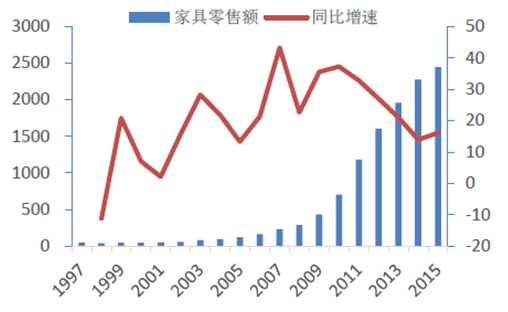 2016年中国家具零售额及增速(亿元,%)