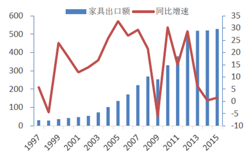 1997-2016年中国家具出口额及增速(亿美元, %)