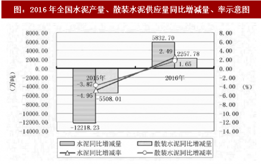 图:2016年全国水泥产量、散装水泥供应量同比增减量、率示意图