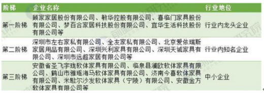 目前行业集中度比较分散,小企业大多定位于国内低端市场,且产品同质化较为严重;另一方面,具有品牌、渠道优势的规模企业主要定位于中高端市场。目前,国内知名的软体家具生产厂商主要有顾家家居股份有限公司、香港敏华控股有限公司、深圳左右家私有限公司、江苏斯可馨家具股份有限公司、北京爱依瑞斯家具有限公司、斯帝罗兰(中国)实业发展有限公司、喜临门家具股份有限公司等。