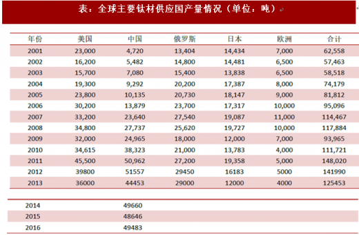 钛加工材的生产主要集中于中国、美国、俄罗斯、日本等国。2010 年,我国超越美国成为世界第一大钛材生产国,但我国大部分钛材都应用于工业领域,技术含量相对不高,而美国主要是航空钛材等高端钛材。表:全球主要钛材供应国产量情况(单位:吨)