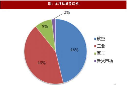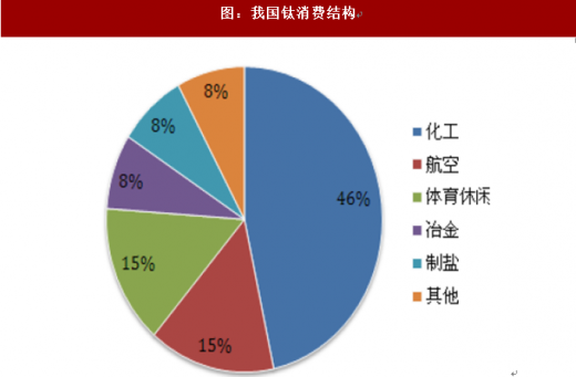 全球商业航空的消费比例达到46%,军用钛材比例为9%(主要为军用航空),整个航空领域消耗钛材比例超50%;工业消耗钛材比例为43%,新兴市场消费钛材比例为2%。但是,钛制品需求结构在地区上存在明显差异,在拥有发达的航空航天和军工国防工业的北美和欧盟地区,尤其是美国, 50%以上的钛制品需求来自于航空航天和军工国防领域。我国虽然是全球最大的钛金属生产国和消费国之之一,但是我国钛制品需求大部分来自化工领域,技术含量相对不高,航空航天领域高端需求占10%左右。具体到化工领域,钛材应用主要为抗腐蚀材料,六大应用领域分别为氯碱、纯碱、真空制盐、石油化纤、精细化工和无机盐。