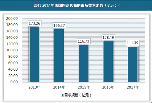 陶瓷机械行业的发展同其下游产业建筑陶瓷等生产行业息息相关。据测算,2017年我国陶瓷机械的市场总需求量在111.39亿元左右,比去年略微下降。