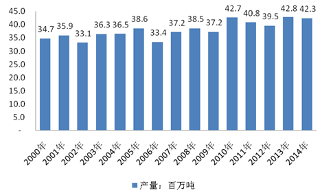 2000年全球花生(带壳)产量为34.7百万吨,2013年增长至42.8百万吨,2014年产量为42.3百万吨。