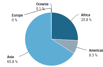 非洲和亚洲是全球花生(带壳)主要产区,其中亚洲产量为总产量的65.8%,非洲产量占全球产量的25.8%。