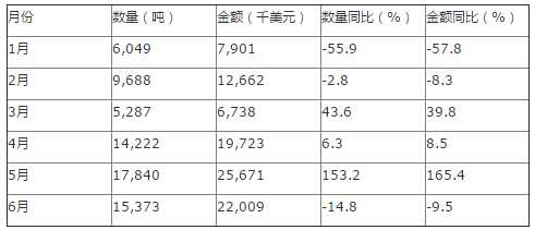 2016年1-6月中国花生油进口数量为68,460吨,同比增长4%;2016年1-6月中国花生油进口金额为94,704千美元,同比增长5.8%。2016年1-6月中国花生油进口量统计表如下表所示: