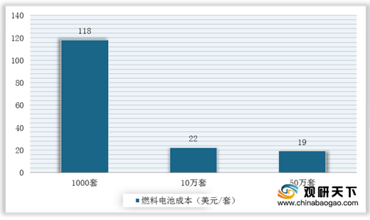 财政部表示,将重点支持关键核心技术研发突破和燃料电池商用车示范应用,探索有效的商业运营模式,提升燃料电池汽车经济性,逐步形成规模效应,整车购置成本将降低。众所周知,在燃料电池成本构成中,电堆成本占比约50%,而膜电极和双极板又在电堆成本中分别占65%、25%。根据美国能源局资料显示,在1000套/年到50万套/年的梯级生产规模中,各组件制造成本明显下降降低,生产规模1000、10万、50万套时,80kw燃料电池电堆成本分别为118美元/套、22美元/套、19美元/套。因此,当大规模量产燃料电池时,生产成本降低。