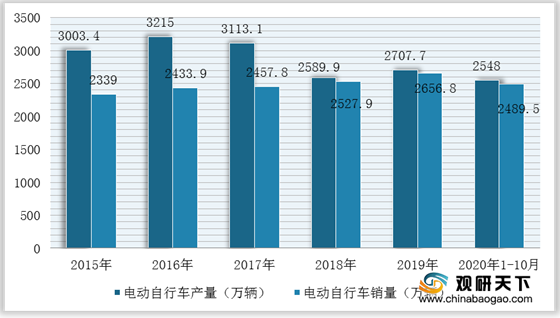 根据数据显示,2019年我国电动自行车产量达2707.7万辆,较2018年增加了117.8万辆,同比增长4.55%,2020年1-10月我国电动自行车产量已完成2548万辆;2019年我国电动自行车销量达2656.8万辆,较2018年增加了128.9万辆。