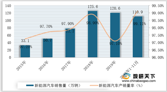 根据资料显示,我国2019年新能源汽车产销分别完成124.2万辆和120.6万辆,同比分别下降2.3%和4.0%。在2020年1-11月,新能源汽车生产完成111.9万辆,同比下降0.1%,降幅比1-10月大幅收窄9.1个百分点;销售完成110.9万辆,同比增长3.9%,增速较1-10月已实现由负转正。