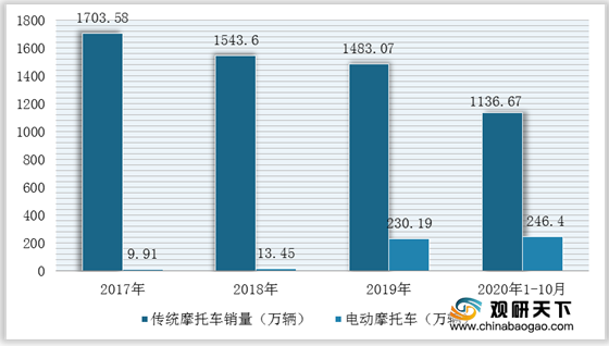 从我国传统燃油摩托车和电动摩托车对比中可以看出我国传统燃油摩托车销量呈逐年下降趋势,电动摩托车销量却呈逐年上升趋势。根据资料显示,2019年我国传统燃油摩托车销量为1483.07万辆,较2018年同比下降3.92%;2019年我国电动摩托车销量为230.19万辆,较2018年同比增长1611.45%。2020年1-10月我国电动摩托车销量为246.4万辆,已超过2019年全年销售量。