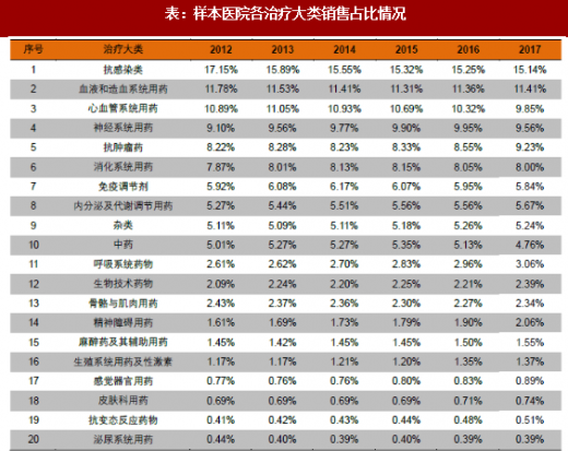 2017年样本医院用药大类占比基本保持稳定,抗感染类、血液和造血系统用药、心血管系统用药仍居前三位,分别占比15.14%、11.41%、9.85%;抗感染类、心血管系统用药、中药等品类下降趋势明显,其中抗感染类由2012年的17.15%下降到2017你那15.14%,心血管系统用药由2012年的10.89%下降到2017年的9.85%,中药由2015年的5.35%下降到2017年的4.76%;抗肿瘤药、生物技术药物、精神障碍用药等品类占比提升较快,其中抗肿瘤药由2012年的8.22%上升到2017年的9.23%,生物技术药物由2012年的2.09%上升到2017年的2.39%,精神障碍用药由2012年的1.61%上升到2017年的2.06%。
