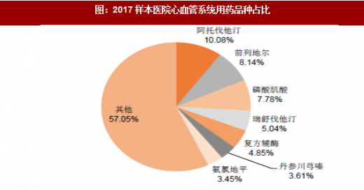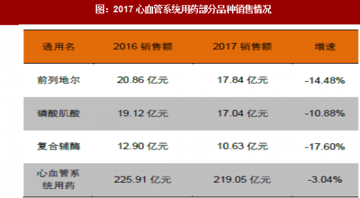 通常认为心脑血管系统用药受益于老龄化趋势和患病率提升,将保持快速增长。但从数据来看,其占比自2013年以来持续下降,2017年更是低于10%,我们认为存在认知差别的原因主要有两个,一是品种老、价值低的仿制药逐步退出市场;二是该领域存在大量改善微循环和代谢调节的辅助用药,如前列地尔、磷酸肌酸、复合辅酶等,从2017年增速来看前列地尔、磷酸肌酸、复合辅酶分别同比下滑14.48%、10.88%、17.60%。