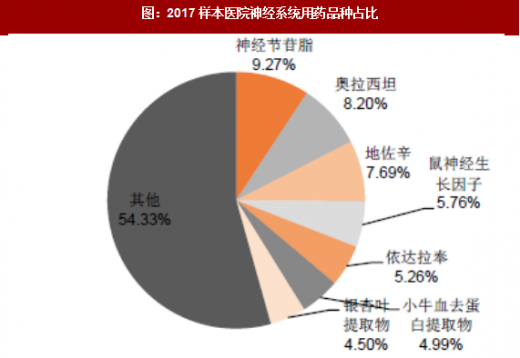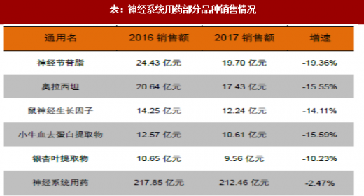 同样受辅助用药政策影响较大的大类还有神经系统用药,其在2012年到2016年占比持续提升,2017年下降明显,主要由于神经节苷脂、奥拉西坦、小牛血去蛋白提取物、银杏叶提取物等占比较大的辅助用药销售额下滑幅度较大。