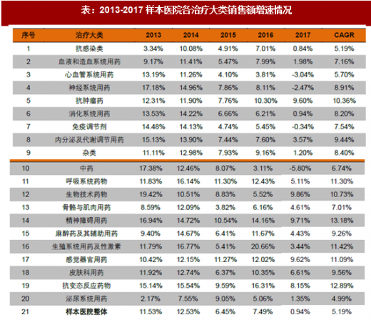 从各大类增速来看,2017年抗肿瘤药、生物技术药物、精神障碍用药保持快速上升势头,分别同比增长9.60%、9.86%、9.71%。