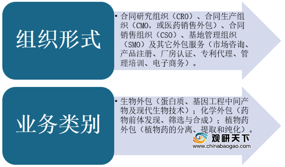 生物医药外包的组织形式包含合同研究组织(CRO)、合同生产组织(CMO,或医药销售外包)、合同销售组织(CSO)、基地管理组织(SMO)及其它外包服务;业务类别包含生物外包、化学外包和植物药外包。