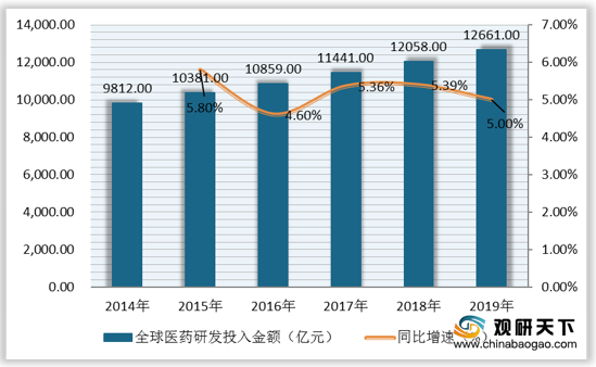 近些年,全球医药研发投入金额逐年上涨,从2014年的9812亿元涨至2019年的12661亿元,复合增长率为5.23%,2019年同比上涨5%。