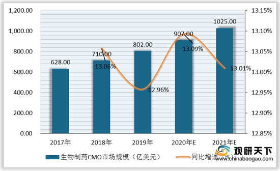 生物制药CMO是一个新兴行业,因生物制药技术的不断突破,使得市场增长趋势明显。2017-2019年全球生物制药CMO市场规模从628亿美元增至802美元,2019年同比增长12.96%。预计到2020年全球生物制药CMO市场规模达907亿美元,同比增长13.09%。
