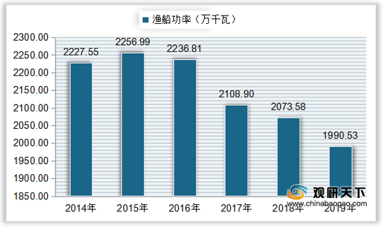 而随着数量与吨位的下降,我国渔船功率也不断减少,到2018年中国渔船功率降至2073.58万千瓦,同比下降1.67%;2019年中国渔船功率下降至1990.53万千瓦,同比下降4%。