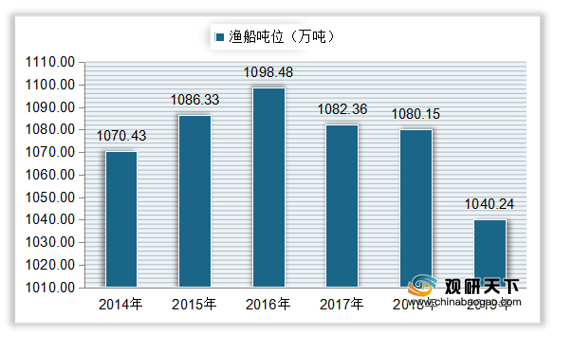 于整体数量相比,我国渔船吨位在2014年到2016年持续上升,随后开始下降,到2018年降至1080.15万吨,同比下降0.2%;2019年中国渔船总吨位下降至1040.24万吨,同比下降3.7%。