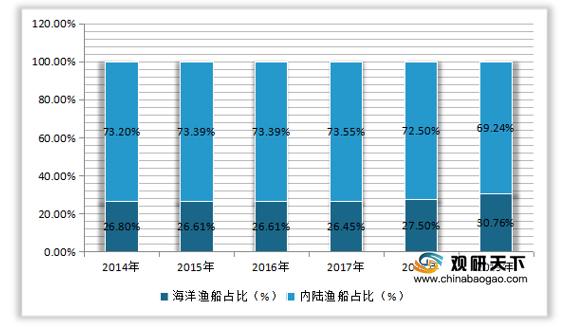 按作业水域来分,我国渔船可以分为海洋与内陆渔船,在数量上内陆渔船占比从2014年到2018年一直保持在73%左右。而随着近几年内陆地区禁渔政策的不断出台,内陆渔船数量也快速下降,到2019年中国内陆渔船数量下降至506276艘,同比下降19.2%,占整体渔船数量比重也有所下降,为69.24%,较上年减少3.26个百分点;海洋渔船数量为224893艘,同比下降5.34%,占比整体渔船数量的30.76%。