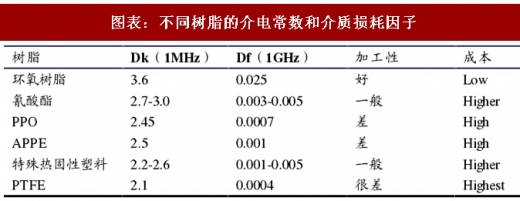 传统环氧树脂由于本身具有含量较大的极性基团,介电性能较高,通过使用其他类型树脂例如:聚四氟乙烯、氰酸酯、苯乙烯马来酸酐、PPO/APPE 以及其他改性热固性塑料等低极化分子结构来实现低介电常数与低损耗材料。