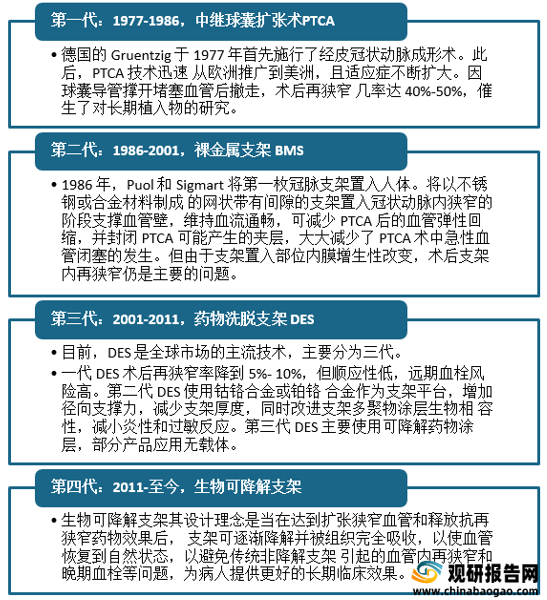 冠脉支架全称为冠脉支架,是心脏介入手术中常用的医疗器械,具有疏通动脉血管的作用,因此又称为心脏支架。我国冠脉支架最早出现在20世纪80年代,发展至今,共经历了金属裸支架、金属药物支架、可降解支架三代产品。