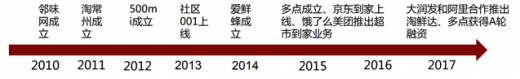随着移动互联网、定位服务的发展,超市到家业务也不断地发展,社区001、爱鲜蜂等公司不断成立。从2015年开始,超市到家进入了混战,多点、京东到家纷纷上线,饿了么、美团也在一级界面上开设了超市到家的业务,阿里以盒马、淘鲜达等强势入局,各种全新的模式和资金的不断注入,使得到家市场进入新的格局。