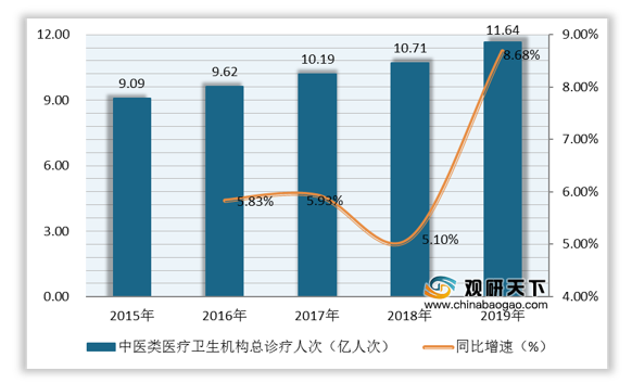 近些年,我国中医类医疗卫生机构总诊疗人次不断增长,从2015年的9.09亿人次增至2019年的11.64亿人次,复合增长率为6.38%;2019年同比增长8.68%。