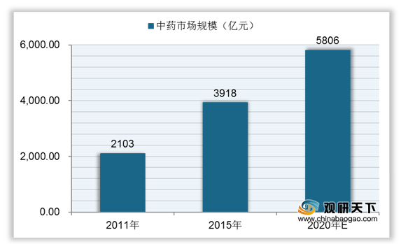 由于我国中医类诊疗人数上升加上人们健康意识增强,中成药及饮片等相关产品需求增多,带动中药行业市场规模逐年增长,从2011年的2103亿元增至2015年的3918亿元,复合增长率为16.83%。2016-2019年中药行业仍将快速发展,预计到2020年我国中药市场规模将达5806亿元。