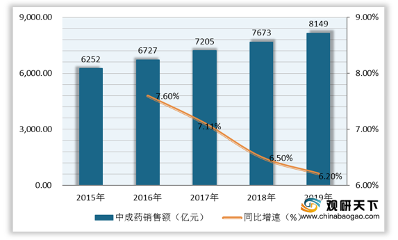 中成药方面,2015-2019年我国中成药销售额增速有所放缓,从7.6%放缓至6.2%;2019年中成药销售额为8149亿元。