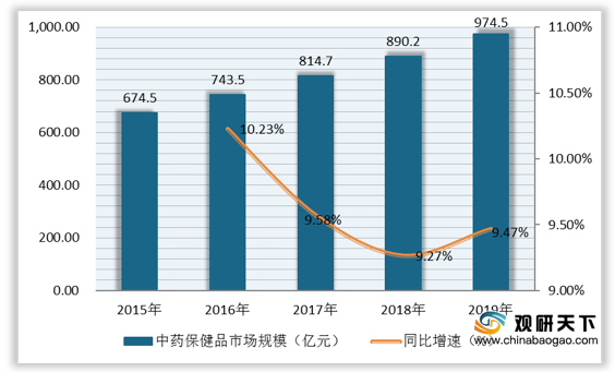 中药保健品方面,2015-2019年我国中药保健品市场规模增速呈先降后升趋势,2016-2018年同比增速从10.23%降至9.27%;2019年中药保健品市场规模同比增速回升9.47%至974.5亿元。