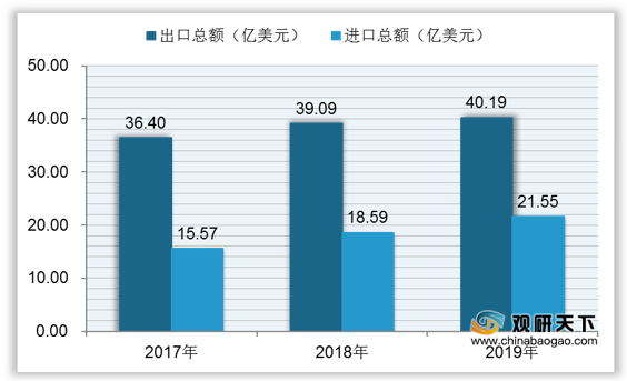 进出口方面,2017-2019年我国中药类商品进出口贸易总额均保持上涨趋势,2019年中药类商品出口贸易总额为40.19亿美元,同比上涨2.81%;进口贸易总额为21.55亿美元,同比上涨15.92%。