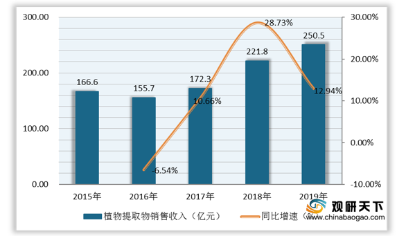 植物提取方面,2015-2019年我国植物提取物销售收入略有波动,2016年植物提取物销售收入为155.7亿元,同比下滑6.54%;2017年开始回升,到2019年我国植物提取物销售收入为250.5亿元,同比增长12.94%。