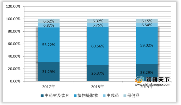 从2017-2019我国中药类细分产品出口贸易占比情况来看,近六成产品是植物提取物,远高于其他产品;近三成产品是中药材及饮片。