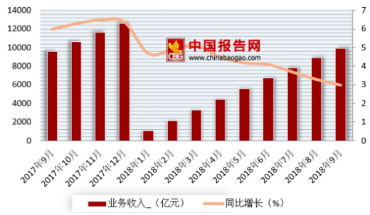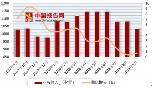 根据中国统计局数据显示,2018年1-9月我国电信业务总收入9914.7亿元,累计同比增长3%,较1-8月下降了0.3个百分点。9月我国电信业务收入1033.9亿元,比去年同期增长0.7%,较8月增速上升了0.3个百分点。