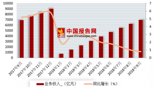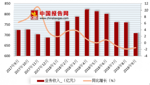 根据中国统计局数据显示,2018年1-9月我国移动通信业务总收入6997.1亿元,累计同比增长0.8%,较1-8月下降了0.2个百分点。9月我国移动通信业务收入710.6亿元,比去年同期下降1.5%,较8月增速上升了0.4个百分点。