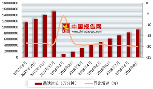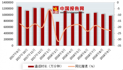 根据国家统计局数据显示,2018年1-9月我国固定本地电话通话时长9351513.1万分钟,累计同比下降20%,较1-8月下降了0.3个百分点。9月我国固定本地电话通话时长974648.2万分钟,比去年同期下降22.7%。