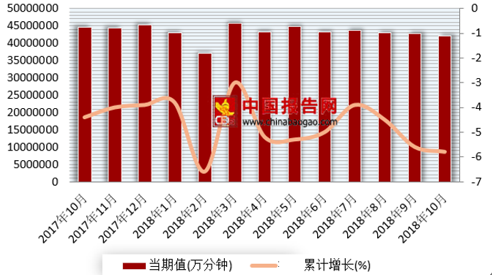 根据中国统计局数据显示,2018年1-10月我国移动电话通话时长为429089972.2万分钟,累计同比下降4.7%。10月我国移动电话通话时长为41983404.5万分钟,比去年同期下降5.8%,较9月增速下降了0.2个百分点。