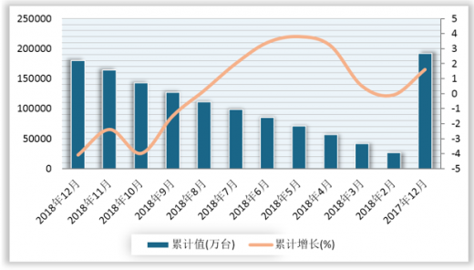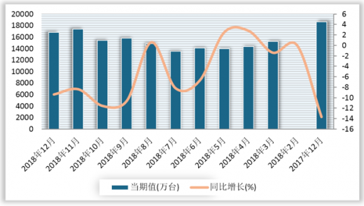 根据国家统计局数据显示,2018年1-12月我国手机产量累计179846.4万台,较去年同期下降4.1%。其中,12月我国手机产量为16843.4万台,同比下降9.4%,较上月减少560.9万台。