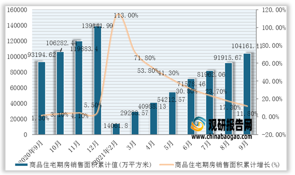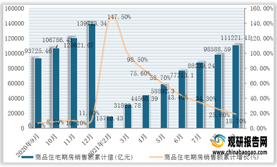 据国家统计局数据显示,2021年1-9月我国商品住宅期房销售额累计值为111221.15亿元,累计增长18.7%。