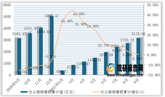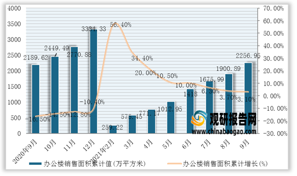 据国家统计局数据显示,2021年1-9月我国办公楼销售额累计值为121957.26亿元,累计增长17.8%。