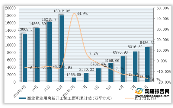 其中,福建省、辽宁省、广西壮族自治区位列全国前三,2021年1-8月其商业营业用房新开工施工面积分别为726.25万平方米、670.73万平方米、659.85万平方米,累计增速分别为-18.5%、-22%、-2%。